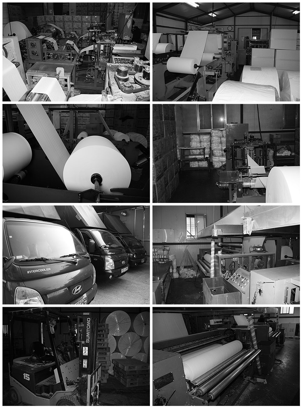 화장실용 티슈(bathroom tissue)로 백색의 재생펄프 원료로 생산한 초지원지를 사용합니다.